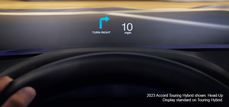 The Touring Hybrid trim's Head-Up Display projects important driver information directly onto the windshield, so you can see your speedometer, navigation directions, and Honda Sensing® status in front of you without taking your eyes off the road.